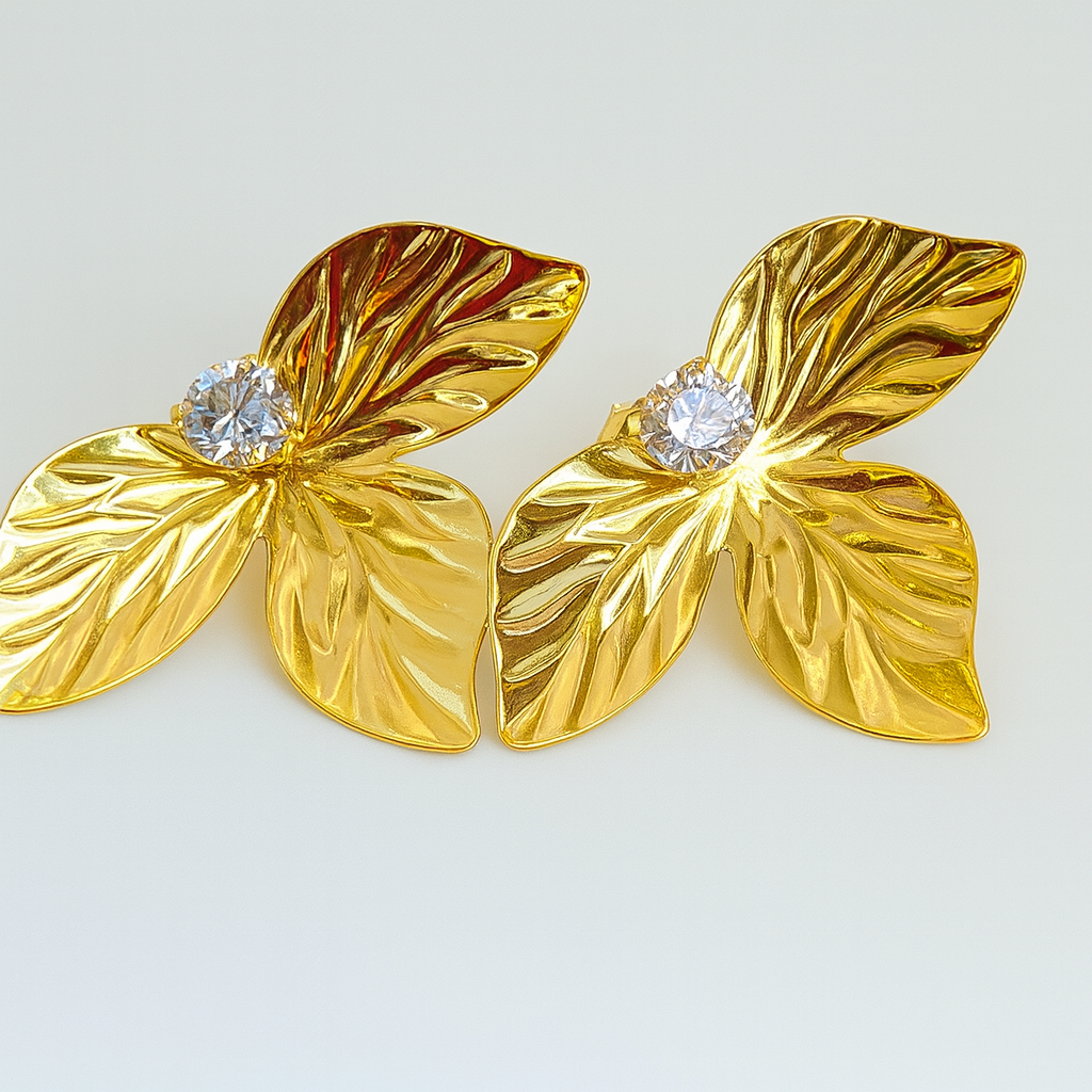 Brinco banhado a ouro em formato de flor com três folhas delicadamente texturizadas, que transmitem sofisticação e feminilidade. O detalhe central em zircônia brilhante traz luminosidade e elegância, tornando a peça versátil para uso no dia a dia ou em ocasiões especiais.