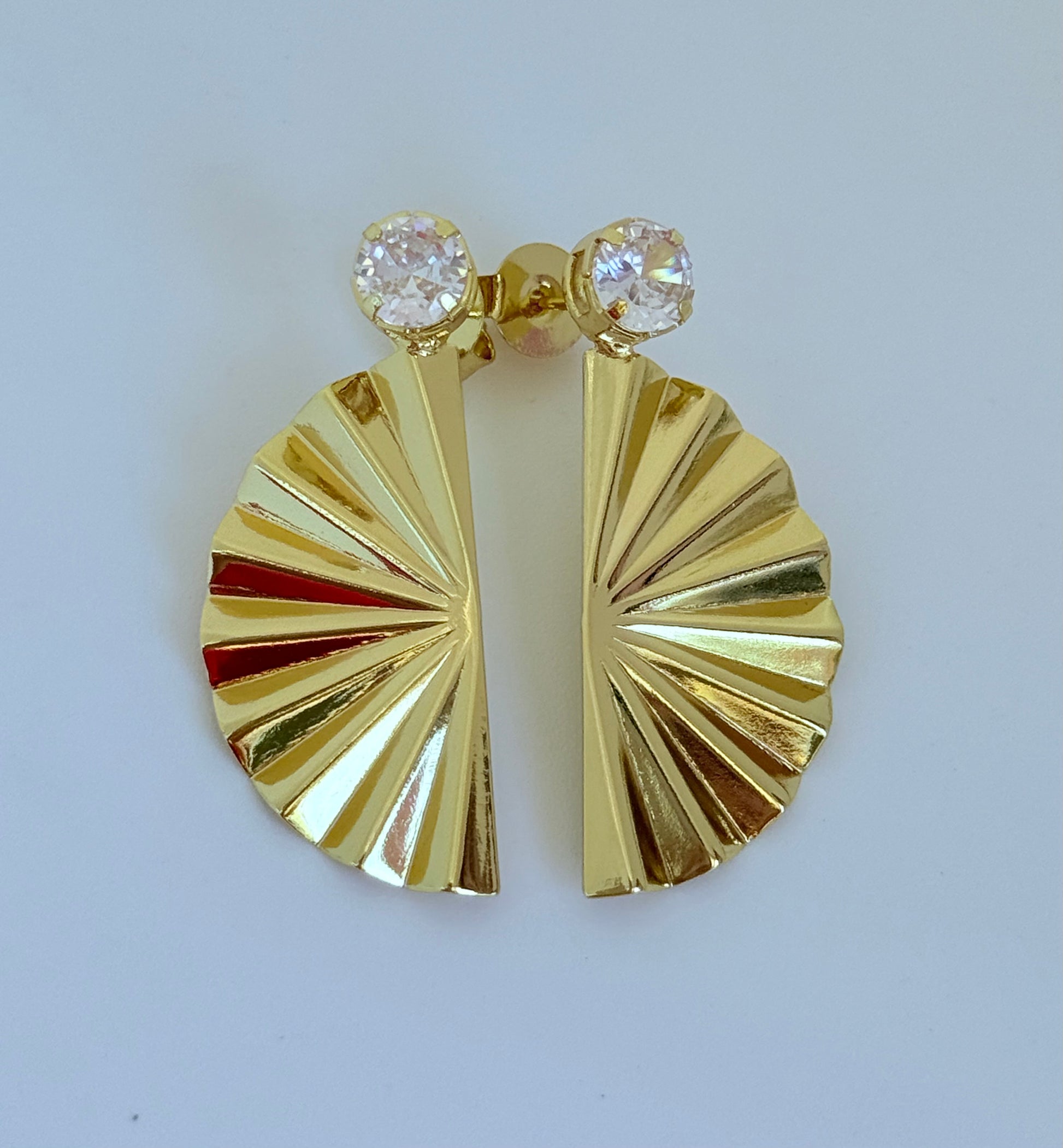 Brinco banhado a ouro com design em formato de leque, trazendo movimento e sofisticação. O destaque fica por conta da zircônia cravejada na base, que adiciona brilho e elegância à peça. Um acessório moderno e versátil, ideal para compor produções elegantes e cheias de estilo.