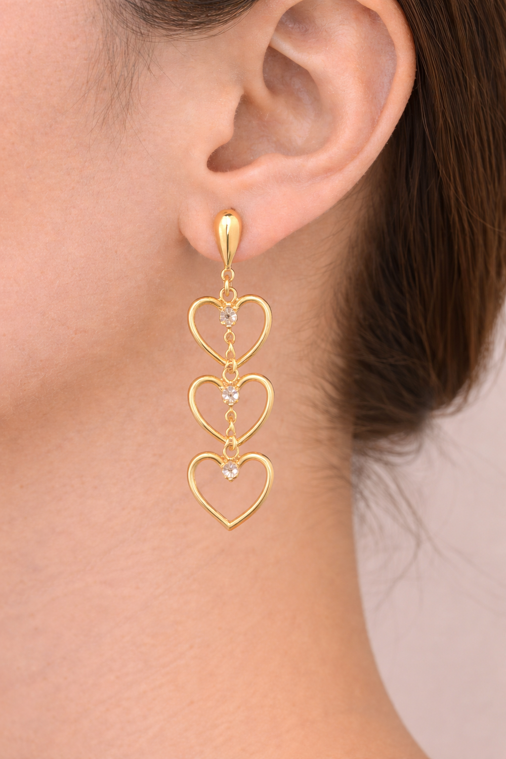 Modelo alongado com design delicado e feminino, composto por três corações vazados em sequência, interligados por pequenos pontos de luz que trazem brilho sutil e sofisticado.