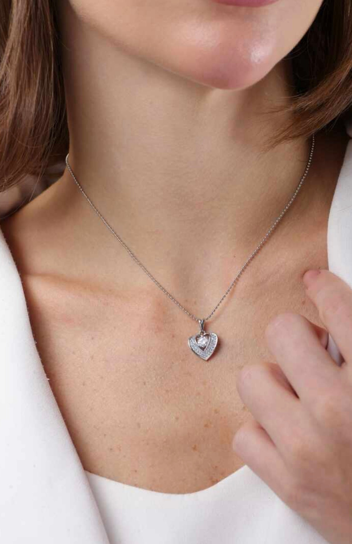 - Pingente: Formato de coração duplo, cravejado com zircônias brilhantes
