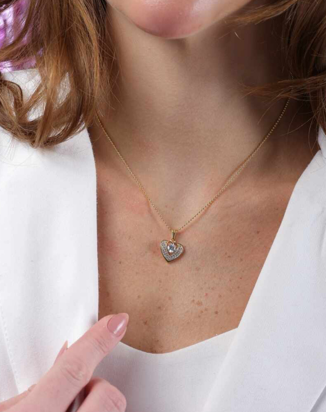 - Pingente: Formato de coração cravejado com zircônias, destaque central em pedra lapidada em formato coração
