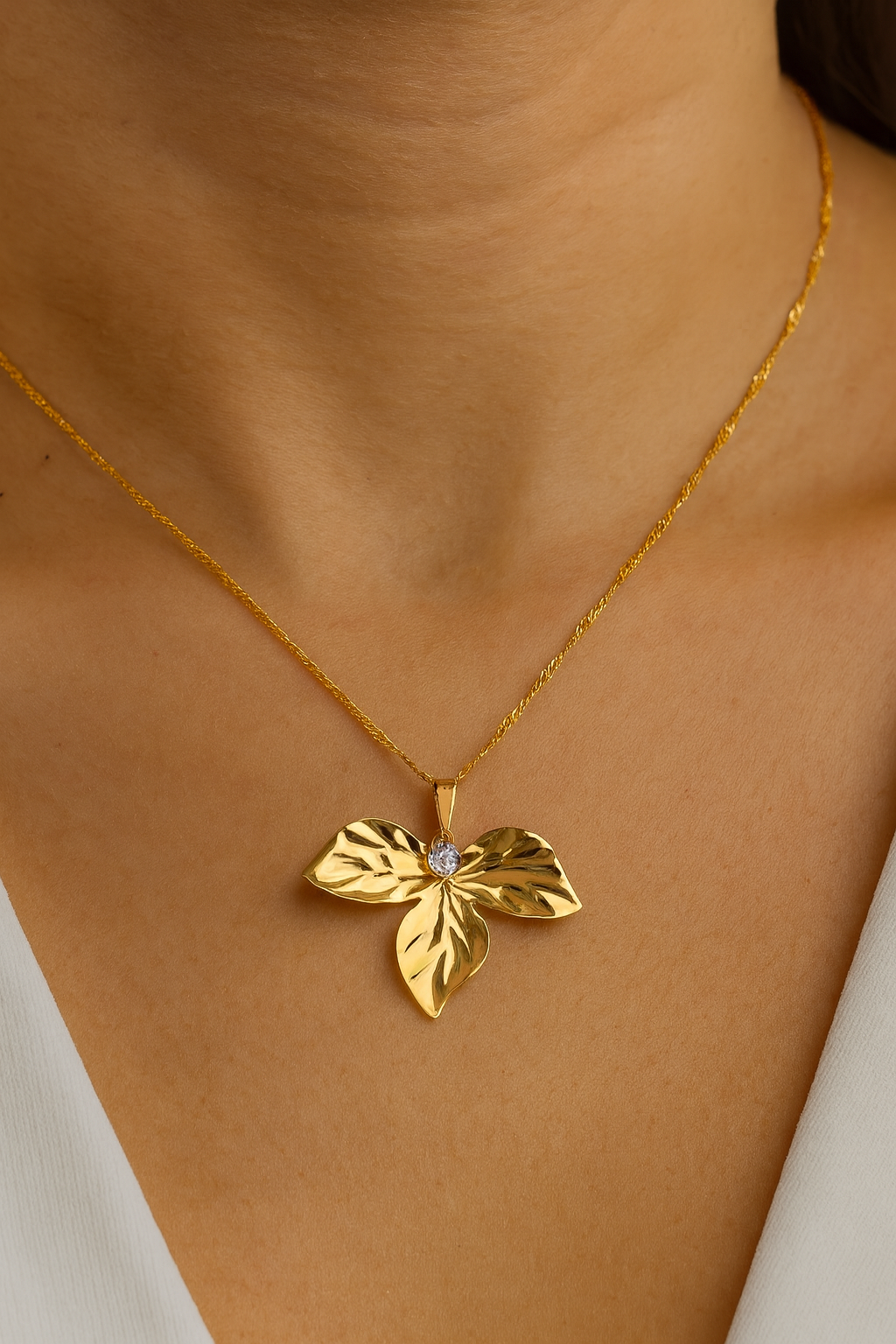- Pingente: Formato de folha estilizada com detalhes em relevo