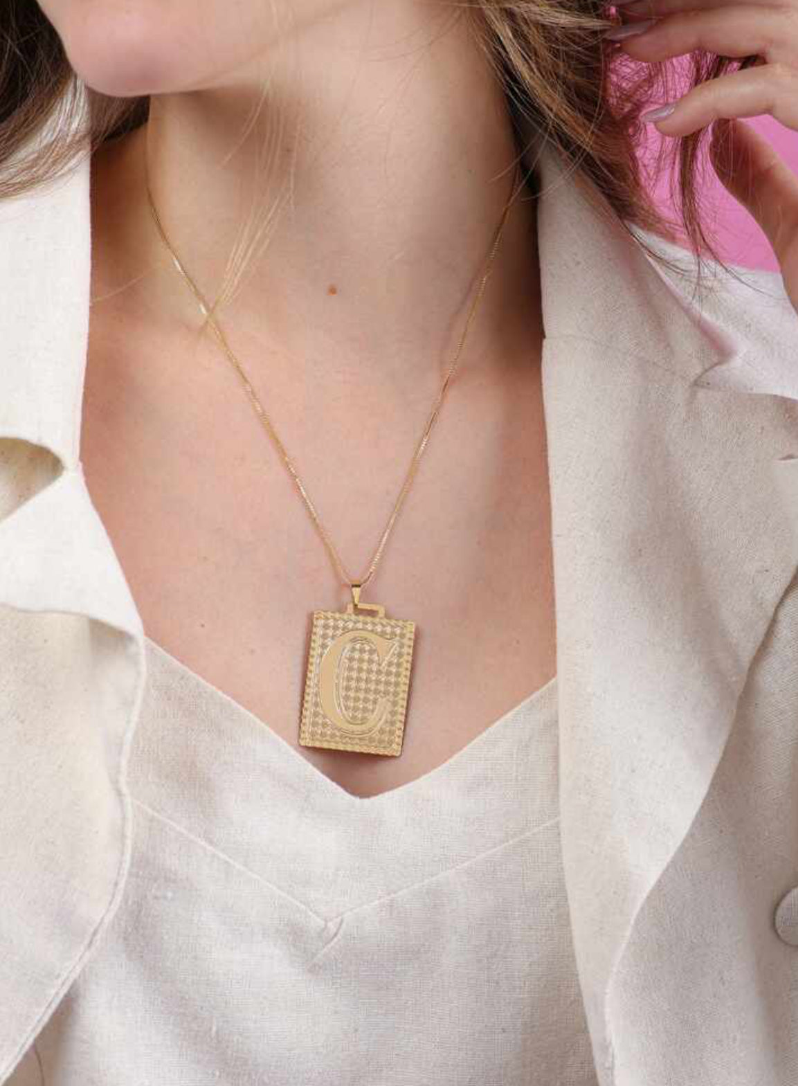 - Pingente: Medalhão retangular com design texturizado e letra em destaque