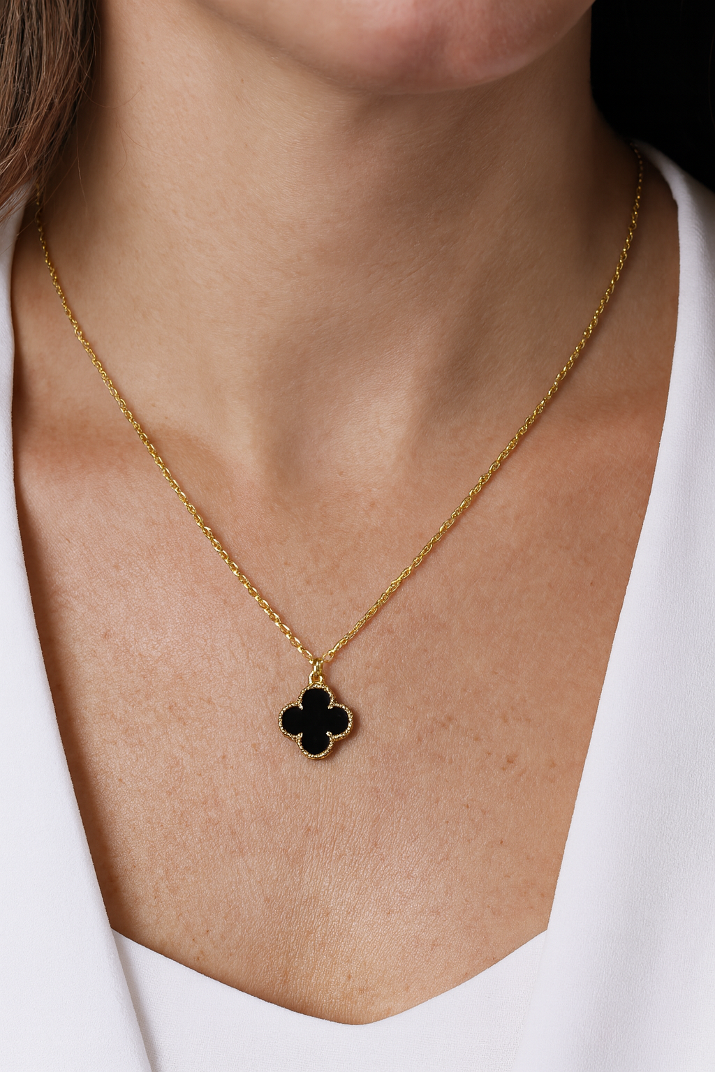 Elegante e sofisticado, este colar traz um pingente em formato de trevo com detalhe em resina preta, criando um contraste moderno e atemporal. A corrente delicada banhada a ouro 18k realça ainda mais o charme da peça, tornando-a perfeita para uso no dia a dia ou em ocasiões especiais. Um acessório que simboliza sorte e estilo em cada detalhe.
