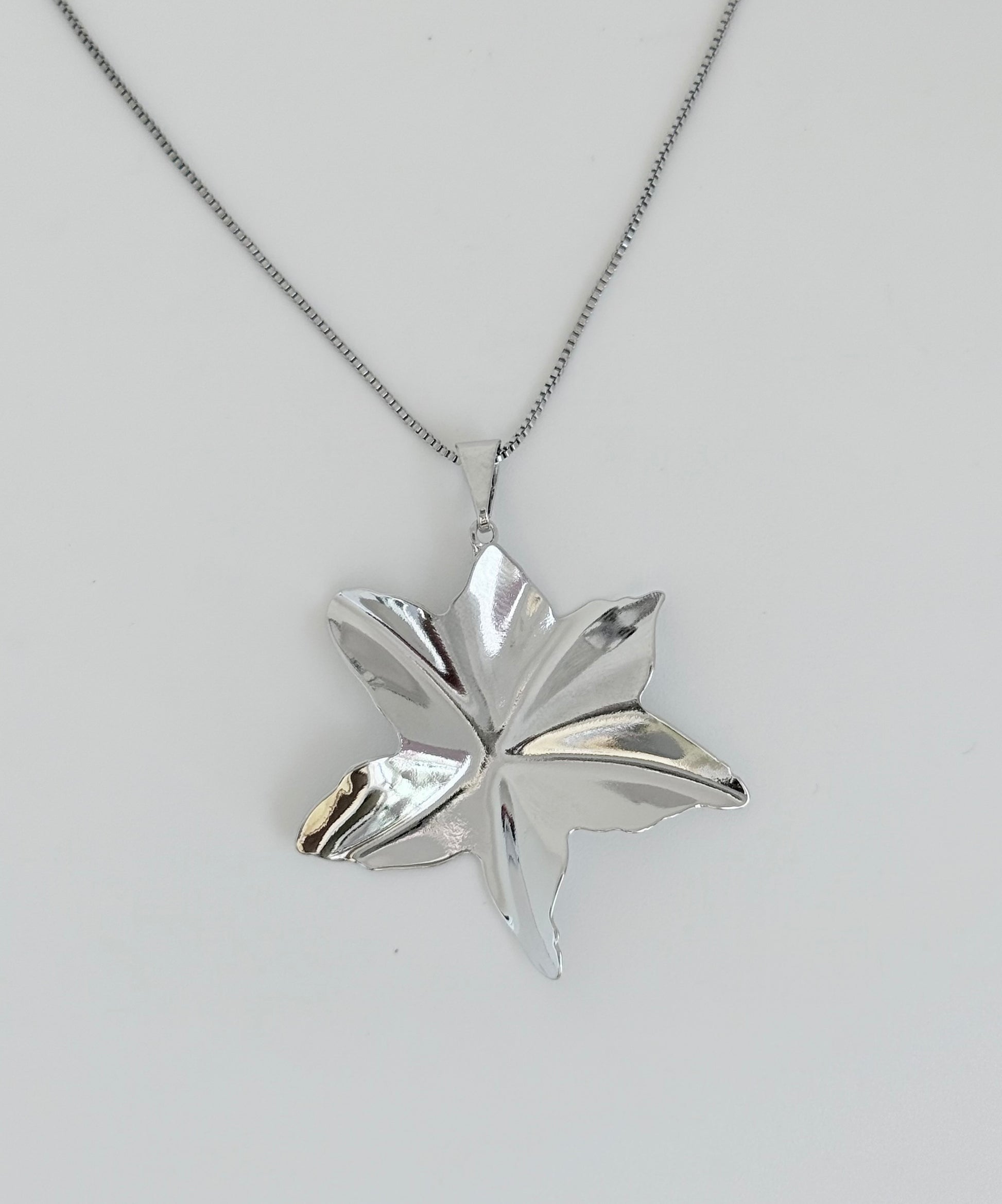 Colar banhado em ródio com pingente em formato de flor de cinco pontas, símbolo de sofisticação e estilo.