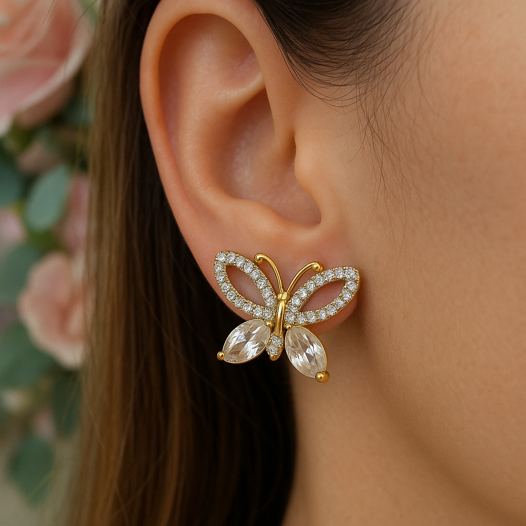 Encante-se com o Brinco Borboleta Dourado, uma peça que une leveza e sofisticação.