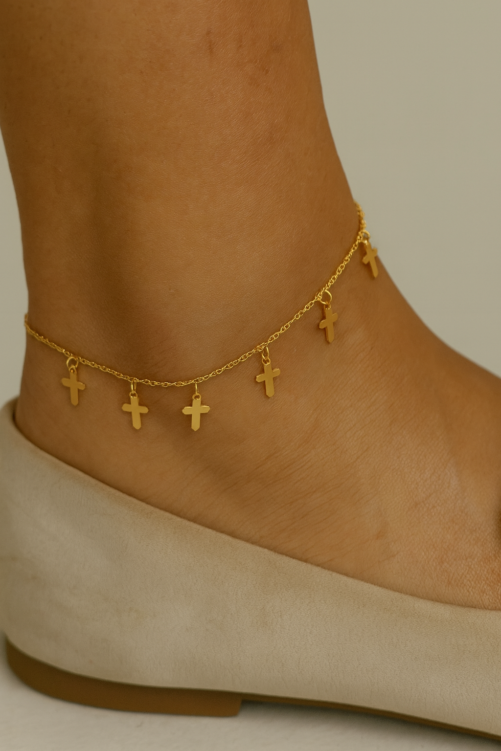 Tornozeleira banhada a ouro 18k, delicadamente adornada com pequenos pingentes em formato de cruz.